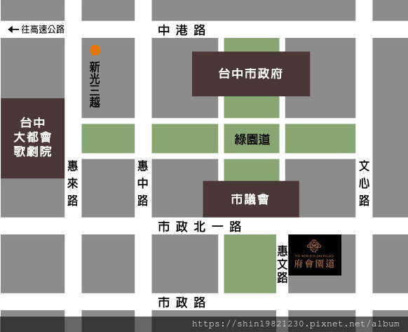 大台中升格促動新市政重大建設發展,七期頂級居住行情皆圍繞著新市政府、新市議會、大都會歌劇院三大地標發展,而「府會園道」基地位於「低密度生活特區」範圍,近享新市議會廣場、園道悠閒生活價值,宏觀政經軸線國際地段增值性,正好符合台商置產條件。為打造頂級御所的寧靜與舒適,「府會園道」臨路退縮10米,迎賓車道禮遇尊榮,規劃新古典美學宫式御所,嚴擘SRC制震結構,挑高11米建築基座,漫步在列柱迴廊,享受繁華中難得的園道生活。